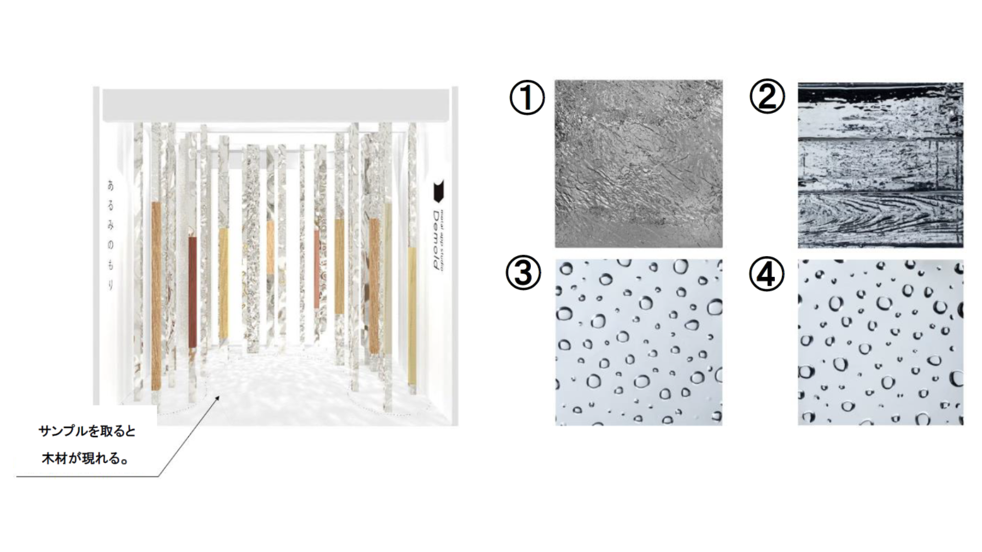 Demoldでは熟練の金属加工技術を活かし、金属素材が持つ「軽さと加工性」「質感と意匠性」「自然との親和性」を独自の視点で表現し続けてきました。今回の出展では、「あるみのもり-Demoldを“からだで感じる”森-」をテーマに、視覚と触覚によって、素材の魅力と可能性を体感できる展示をおこないます。右:①氷壁 ②ウッドパネル(woodpanel) ③泡沫(utakata) ④鏡雫(kyoushizuku)